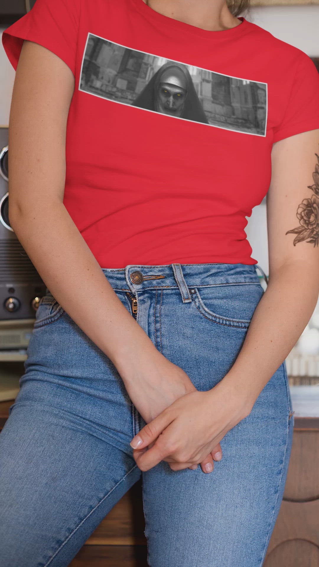 If you love horror movies, the nun shirt will be the perfect addition to your wardrobe. With plenty of sizes for both men and women, the nun shirt is a spooky fashion statement which is fun to wear on a date or when going out on the town.The nun shirts are a stylish way to show your love for the show and celebrate a catholic horror movie.The Nun shirt is a unique gift for horror movie fans of all genders.The nun shirt, made by da pop up, is an affordable, one-of-a-kind horror movie t shirt. The nun shirt designed by da pop up
